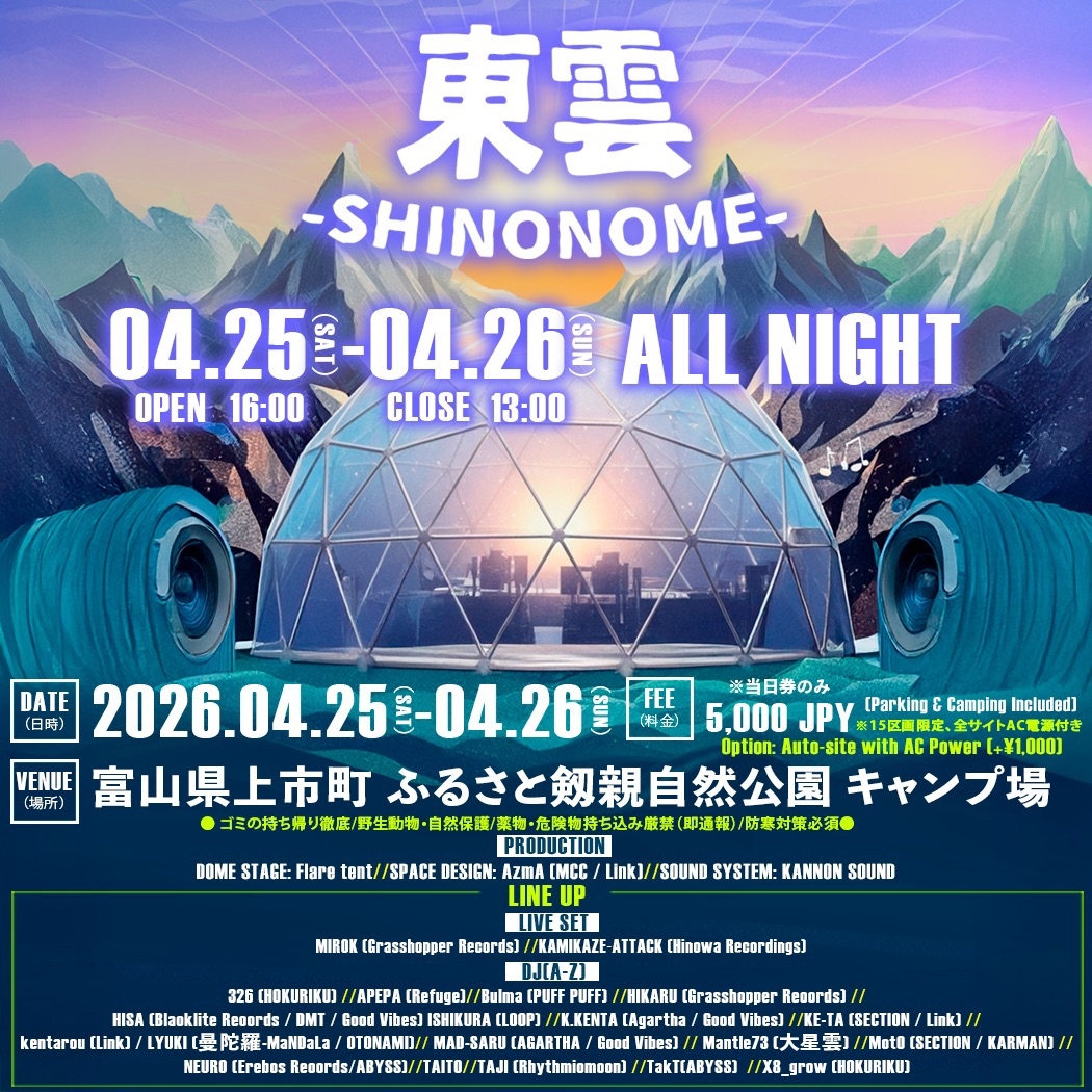 富山県上市町。北アルプスの名峰「剱岳」を眼前に望むキャンプ場を舞台に、21時間の野外パーティーを開催します。